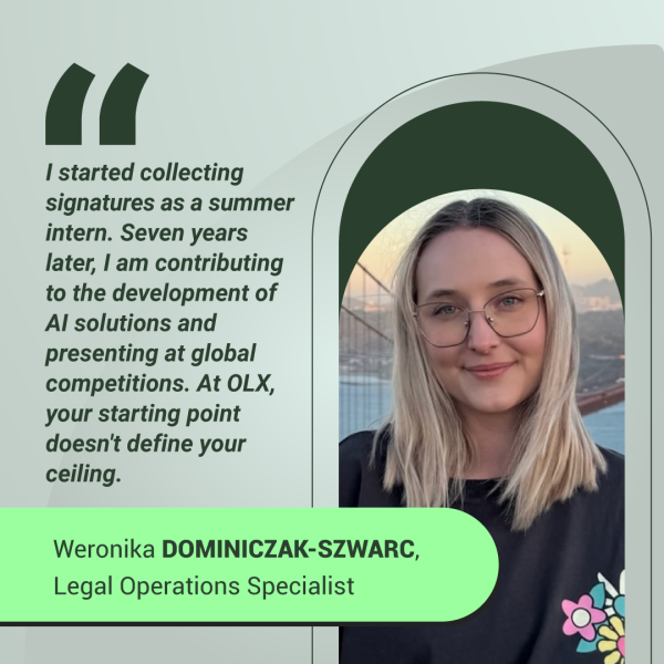 In 2019, Weronika Dominiczak-Szwarc walked into OLX as a summer intern in the Legal department. Her job? Administrative support – collecting signatures, archiving documents, making sure the paperwork ran smoothly.